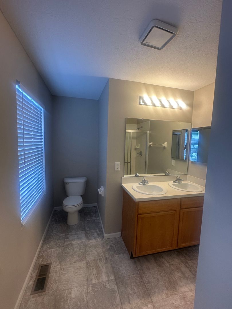 Large primary suite with double sinks and a stand-up shower